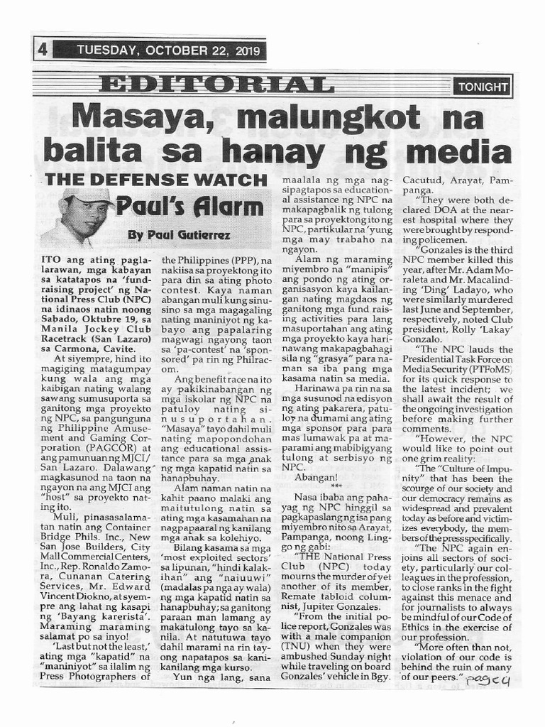 Peoples Tonight Oct 22 2019 Masaya Malungkot Na Balita Sa Hanay Ng Media Pdf